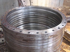 大直徑法蘭的毛坯,這樣的毛坯留有加工余量。一般是內外徑各有5個的余量,厚度也是5個或者更多的加工量,然后在加工余量上在進行產品的壓平、車制光面及螺栓孔等工序。 最為常見的主要有平焊